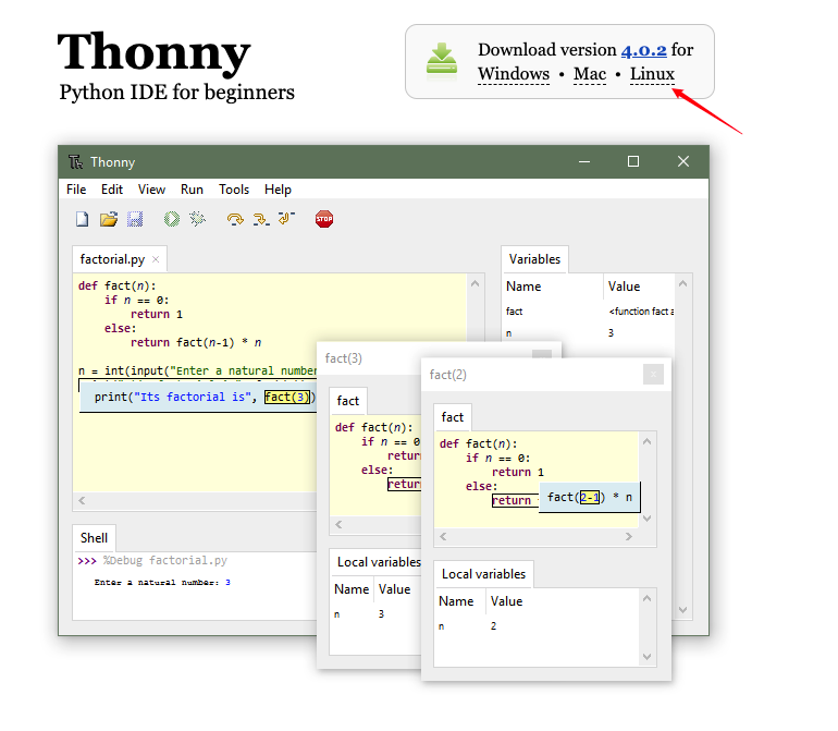 - Select the Linux version to download at https://thonny.org/, and follow the prompts to install: